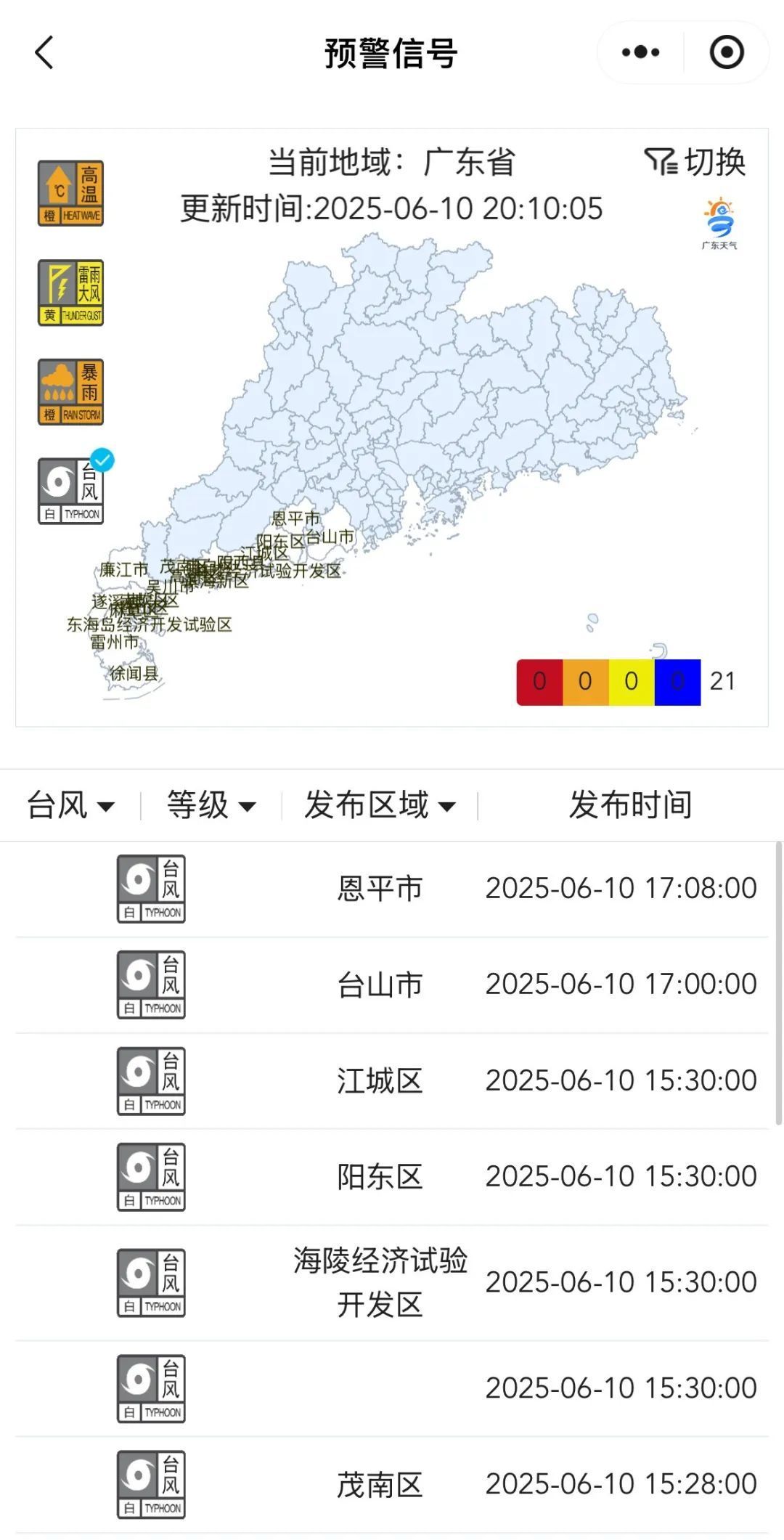 截至10日20时10分,广东恩平、台山、廉江等21地已发布台风白色预警信号。